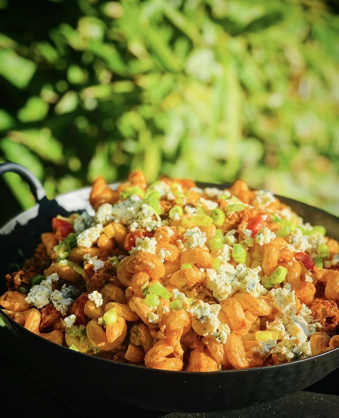 I loved this buffalo chicken pasta salad! It was so creamy, and making the fried chicken and adding fresh blue cheese definitely stepped it up. A couple of things I did was I marinated the chicken in a buttermilk mixture for at least 24 hours so the chicken is flavorful and will be able to stick to the flour mixture better. Also, on the chicken as I coat it in the flour mix I pressed the chicken in it to make sure it would stick. If you want a thicker coating you could try dipping in flour back in buttermilk mix and then back in flour then put in fryer for about 6 minutes.