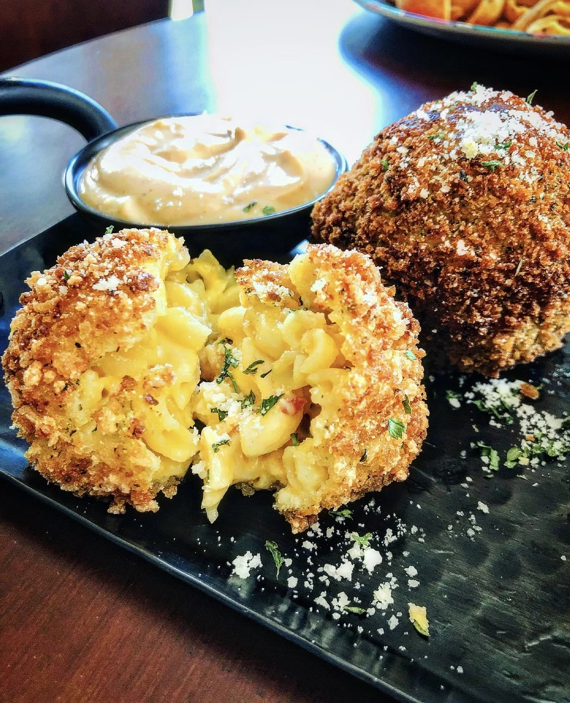 In a frying pan add the oil and turn heat to medium-high. Oil needs to be 375 F max. Once the oil is ready pull out mac and cheese balls and begin to fry. Fry to a golden brown, takes a couple of minutes, then pull out, salt and sit on paper towel.